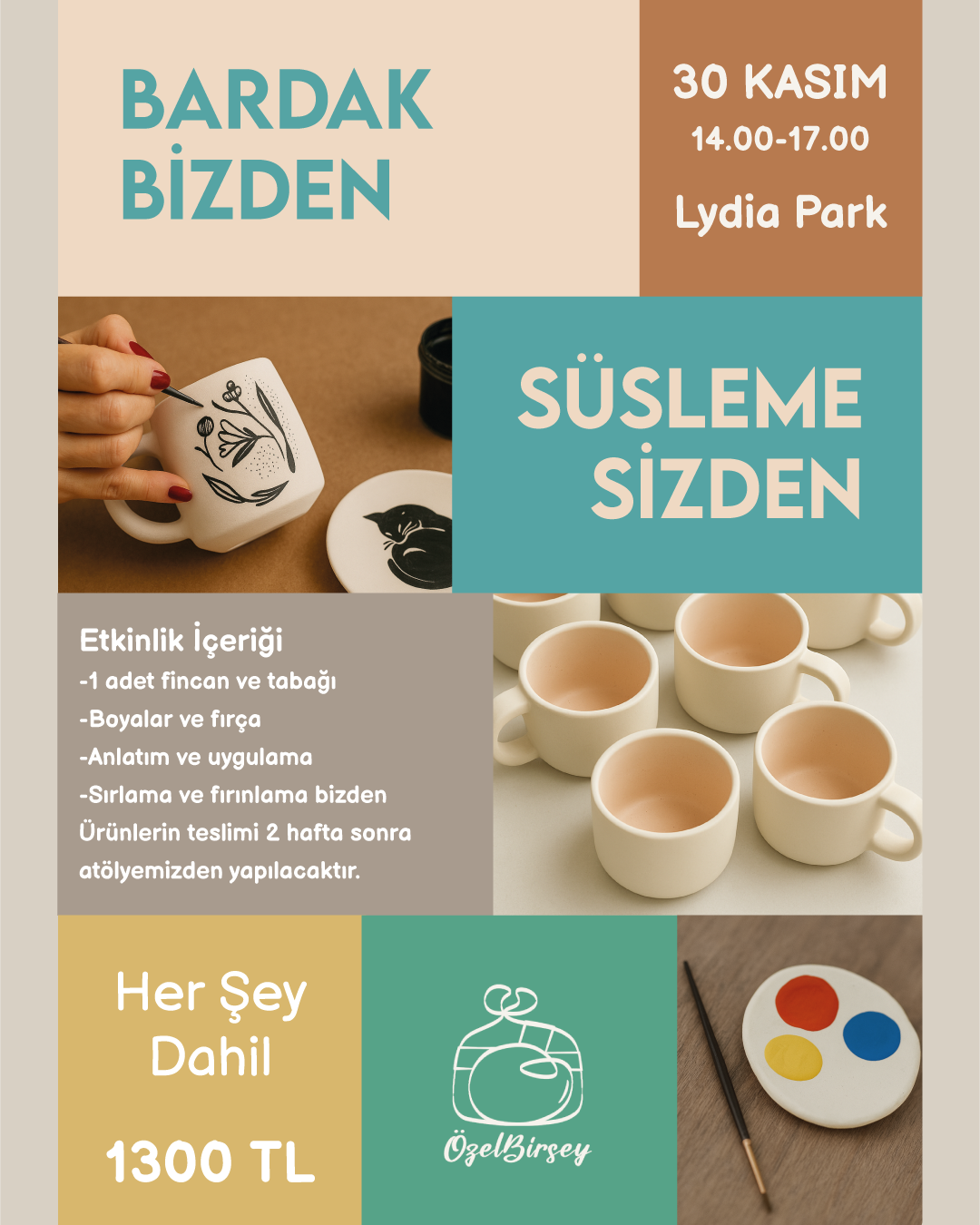 Hazır fincan ve tabak takımını, desen örnekleri ve boyalar eşliğinde dilediğin gibi kişiselleştireceğin keyifli bir boyama atölyesi sizi bekliyor.
